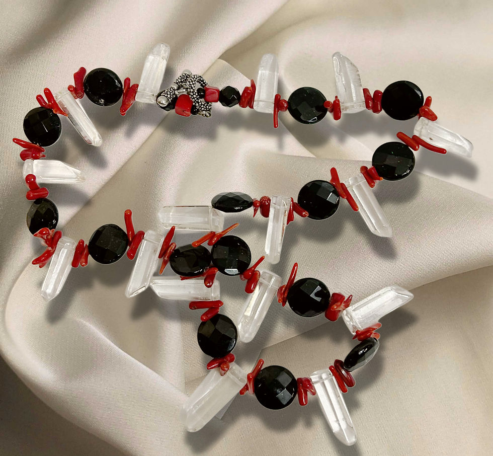 Unisex Coral, Quartz, & Onyx Bead Necklace